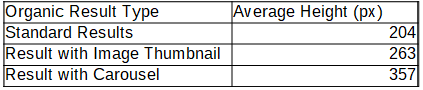 What’s interesting about these two feature types, is 1) at 357px, a organic result with a carousel is 75% larger than a standard organic result and 2) how common these features are. 25% of the organic results I checked had either an image thumbnail or a carousel. And of the SERPs I checked over half of them had 5 or more results with either an image block or image carousel. That means each of those SERPs are at least twice as long as a SERP without those features because of how much carousel and image thumbnails push down other results.