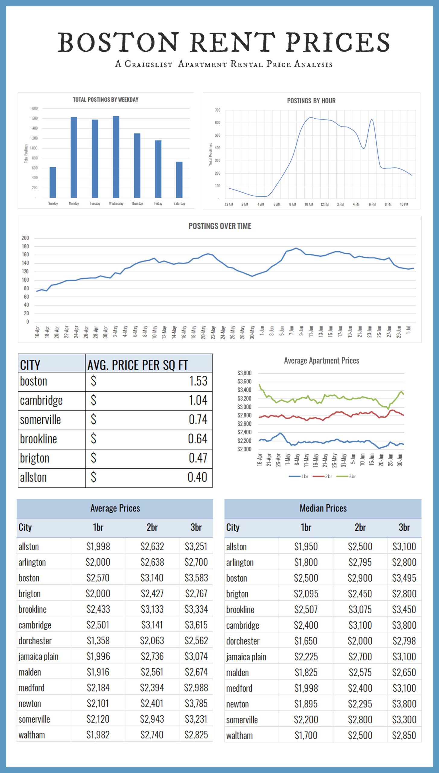 The data wasn’t as interesting as I’d hoped it be, but over a year or more it likely will be. Still I was able to confirm that most of the unbelievable trends in rent prices around Boston are mostly accurate.