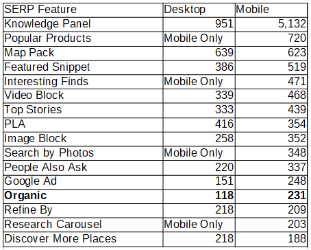 Additionally, since we know how large some features are on average, if you have rank tracking software that tracks SERP features in detail use this information to your advantage. For example, a map pack is a little over 600px on both desktop, and an organic ranking is around 120px on average. So why not spend time and effort trying to move a keyword up one position for any of those directly under a map pack? That’s the same result as moving a result up 5-6 rankings if all the results were organic.